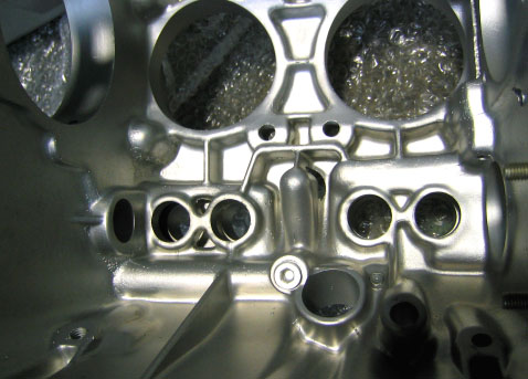 写真2b.ウェットブラスト加工後のシリンダヘッド側面 ウェットブラスト加工されたシリンダヘッドを、プラグ側から見たところ。驚くことに、この複雑なエア・フィンの奥底まで、完全に洗浄されている。 |