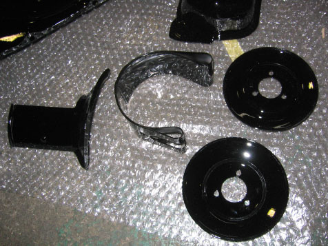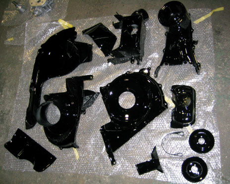写真19.サンドブラスト加工されたエアカウリング類 エアカウリング類は全てサンドブラスト加工し、再塗装が施された。どのパーツを取ってみても、ツルツルのピカピカで、まさにコンクールコンディションのクルマのようだ。もう、なんかもったいなくって、そのまま飾っときたいよ、ホント!ダイナモのプーリーまでもがツルツル!これらの部品は、再塗装後にクリアを数回に渡り吹いているため、かなり長期間に渡りツヤが持続するとのことだった。 |