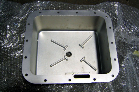 写真21.アルミオイルパン内部 筆者の車に付いていたアルミオイルパンは、まだ新しいものであったが、クランクケースをウェットブラスト加工したのに伴い、その接合性を良くするためにアルミオイルパンもウェットブラスト加工を施した。こういった所、なかなか芸が細かい! |