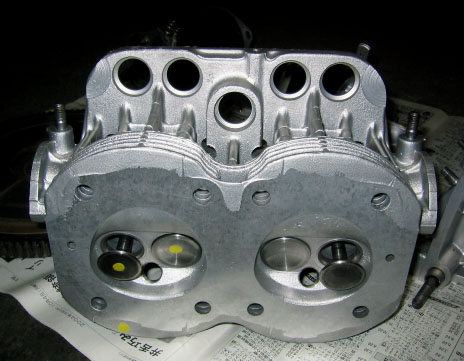 写真4.燃焼室面 シリンダヘッドの燃焼室面。インテークおよびエグゾーストバルブが入っている。シリンダ番号を間違わないよう、片方に黄色のマーキングが施されている。燃焼室の上面は、若干の荒れが見受けられたため、非常に僅かではあるが面研処理にて平滑にしている。面研処理を施すと圧縮抜けを防止することができるが、反面燃焼室容積の減少につながるため、やりすぎると圧縮比が上がり過ぎてしまい、よろしくないとのこと。難しい!!! |