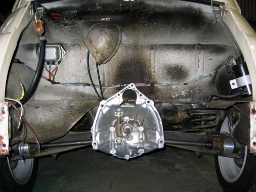 写真12.車体に搭載されたミッション 既にオーバーホールが終了したミッション・コンプリートは、車体に搭載されていた。大分クルマみたいになってきた。エンジンルーム内部は塗り替えていないため、かなり汚れているが、ミッションはピカピカ!!!ああ〜〜アンバランス・・・・そのうちエンジンルームの中も再塗装することにいたしまショっと!!! |