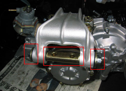 写真2b.実際の使われかた 写真2aのエンジンマウント用ロッドは、実車では写真中央の四角い部分のように搭載される。ロッドは、2本のボルトを介して、リアパネルに固定される。左右両端にあるワッシャーも、今回クロメートメッキされたものが使用される。 |