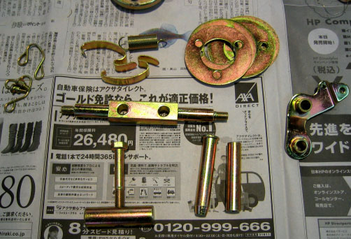 写真2a.エンジンマウント用ロッドとダイナモ用ボルト類 写真中央にある2個の穴が空いたロッドは、エンジンマウント時に使用するもの。その下には、ダイナモをベルトに固定するためのボルトがある。写真右端に縦に置かれている金属製のプレートは、エンジンスロットル部分に用いられるもの。写真上部右には、ダイナモプーリー用のプレートが、またその左側にはスロットルリターン用バネとダイナモ固定ベルトの一部がある。写真左端にある小さな金具は、デストリビュータのキャップを留めるためのもの。このような小さい部品も全てクロメートメッキ処理される。 |