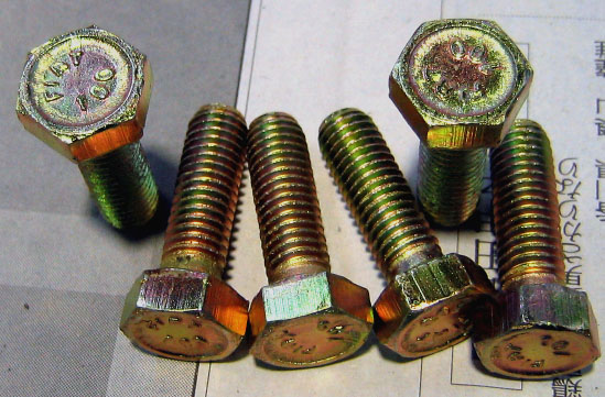 写真5.フライホイール用ボルト 「FIAT」「100」の打刻が付いている。このような部品はオリジナルの貴重品であるため、問題が無い場合にはクロメートメッキを施して使用し、くたびれているものについては新品と交換する。 |