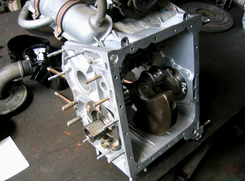 写真8.組み立て中のクランクケース クランクシャフトがマウントされたクランクケース。タイミングチェーン側から撮影したところ。 |