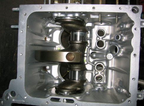 写真9.クランクケース内部 恐ろしくキレイな姿になり、分解前の状態に戻りつつある光景。クランクシャフトのバランサ部分とクランクケースとの隙間は、驚くほど少ない。エンジン・ユニットは非常に精密に構成されていることが判る。 |