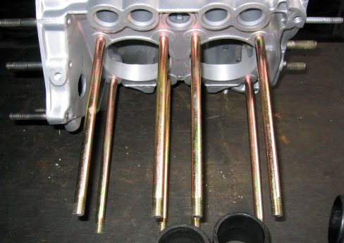 写真12.シリンダーを固定するロッド シリンダー固定用のロッドは1気筒に付き4本ずつ、計8本付いているが、これらもクロメートメッキされた。 |
