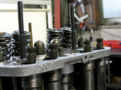 写真5.シリンダーヘッドの上部 袋ナットを全て装着し、固定したところ。この状態ではまだロッカーシャフトは搭載されていない。 |