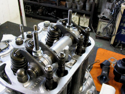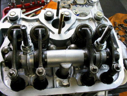写真7.ロッカーシャフト搭載! シリンダーヘッド内部にロッカーシャフトがマウントされたところ。これでプッシュロッドとバルブとが、シャフトを介して接続されたことになる。 |