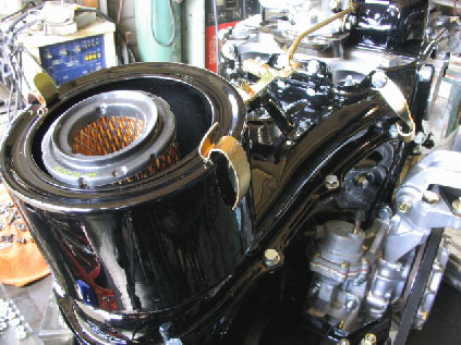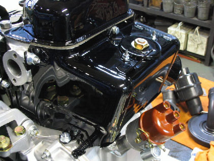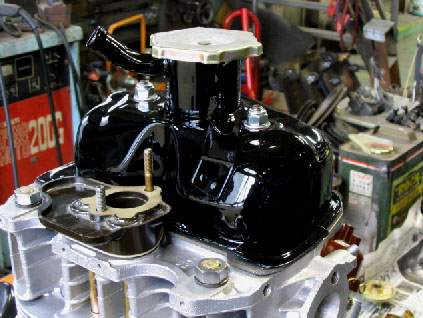 写真9.タペットカバー搭載完了! サンドブラストの後ウレタン塗装とクリアを吹いたタペットカバーを搭載したところ。まるで新車状態!キャブレターのベースマウントも取り付けられている。 |