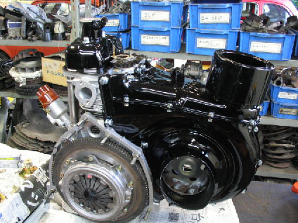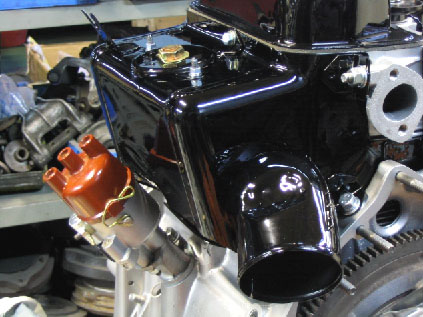 写真10a.サーモスタットケース タペットカバー同様、サンドブラスト、ウレタン塗装、クリア処理されたサーモスタットケース。どこもかしこも黒光りしている!!! |