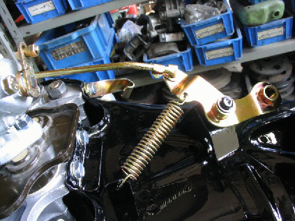 写真14.スロットメカ部分 エンジンスロットのメカ部分のアップ。クロメートメッキされた部品が搭載されている。アクセルワイヤを介してスロットを開閉する部分。スプリングはアクセルリターン用。 |