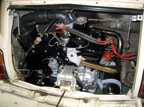 写真0.オーバーホール完了直後のエンジンルーム内部 丹念にウレタン塗装されたエアカウリングの黒と、ウェットブラスト処理されたクランクケースの銀色の対比が映える!オリジナルステンレスマフラーが迫力!!しかし、エンジンルーム内側のボディは、今回塗り替えなかったため元のままの状態。いずれ全塗装する際に、ボディ内面もビカビカにしよう! ヽ(´ー`)ノ |