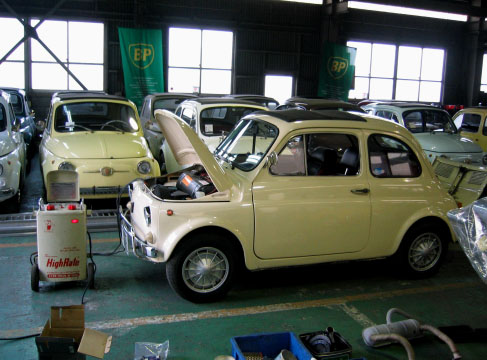 さて、納車引き取り日となった2005年4月29日(金曜日)、実は筆者の体調は絶不調だったのだ。というのも、あろうことか前日の夜、昔の仕事仲間と恵比寿で深酒してしまったのだ。(´ヘ`;)。大事な日を前にして、なぜそれほど飲んでしまったのかと言うとだな!入った店に「十四代」が置いてあったからなのだよ!「十四代」と言えば、日本酒通では知らぬ人はいない名酒であり、同時に幻の酒とも言われている。置いてある店など、そう滅多に無い。今回の店でも、メニューには載っているのだが、在庫しているかどうかは、実際に店員に聞いてみるまでは判らないという、それほどのモノなのである!そして店員に聞いてみたら、運良くあったというワケだ!これを飲まずして何を飲むと言うのだ・・・ そういうわけで、二日酔いでアタマズキズキの午前中を何とか乗り切り、心身を清めた後、午後にオンタリオさんを訪問することと相成った。作業場には、完全に組み上げられた筆者のチンクェチェントが、バッテリーを充電しつつ待っていた。をを、久しぶりの愛車との対面である!そして、エンジンルームの中を見ると、そこは・・・