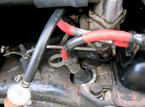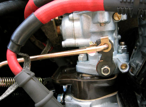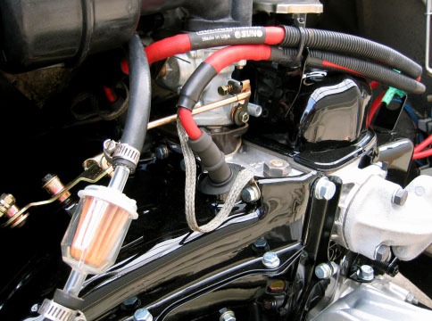 写真6.オーバーホール後のキャブレター部分のアップ スロットル用ロッドのメッキが目立っている。キャブレターも126用新品を搭載しているため、ガソリンのシミも無い。プラグコードは以前使用していたノロジー・ホットワイアをそのまま使用。 |