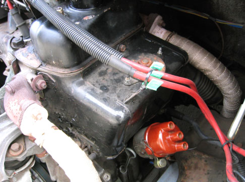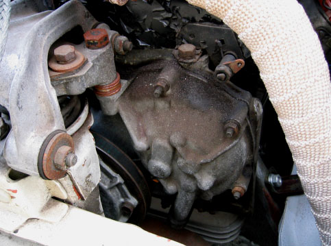 写真2a.オーバーホール前のスパークプラグ周り 懐かしい写真。オーバーホールに出す前の、プラグ周りのエアカウリングの写真である。ご覧の通り、錆びとホコリでくたびれまくっていた! |