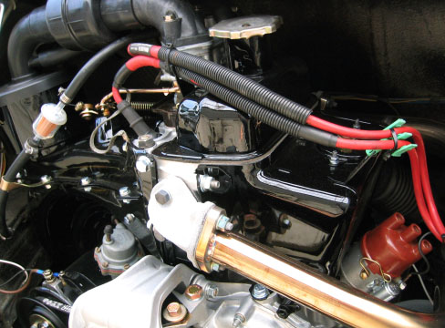 写真2b.オーバーホール後のスパークプラグ周り ほんでもって、これがオーバーホール後の状態。ウレタン塗装されたエアカウリングが、これでもかってくらい黒光している!スロットルメカ部分のクロメートメッキも輝いているぜ! (丶`∀´) |