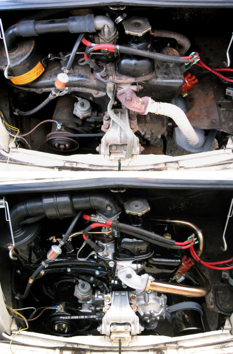 写真8.オーバーホール前後のエンジンルーム内部 最後に一枚。オーバーホール前後のエンジンルーム内部の比較写真を掲載しておく。上が前で下が後であることは、今更言うまでもないな・・・・ ヽ(´ー`)ノ |