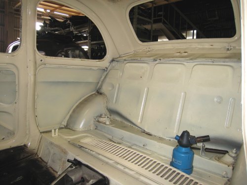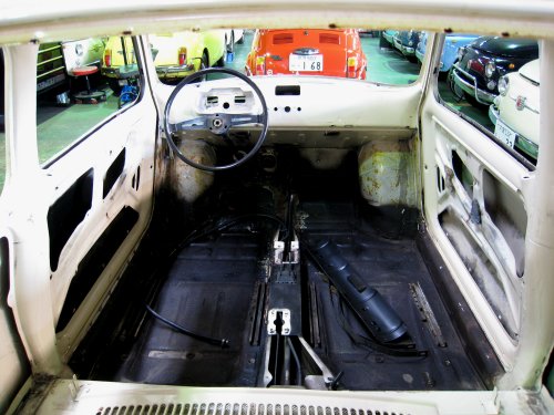 写真3.リアウインドウから覗いた室内 床のゴムマットも剥がされ、床面が完全に露出している。気になっていた錆による穴は見あたらなかった。水はけが良かったのが幸いしたのだろう。 |