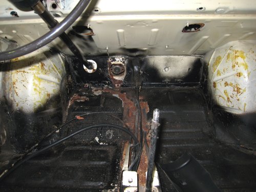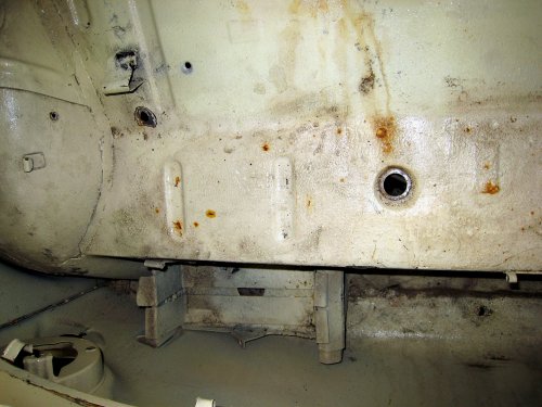 写真5.運転席ペダル部分 ペダル類も前部取り外されている。若干の錆は出ているものの、グサグサになっていたり穴が空いていたりはしていないので、上々のコンディションだと言えるだろう。ステアリングの右側にある黒く丸い部分は、ブレーキマスターシリンダーの末端。手前にシフトノブが見える。 |