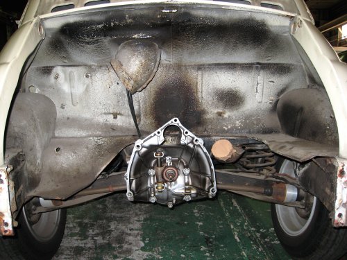 写真2.エンジンを降ろされた500の後ろ姿 ウィンカーランプも含め、全て取り外されている。 |