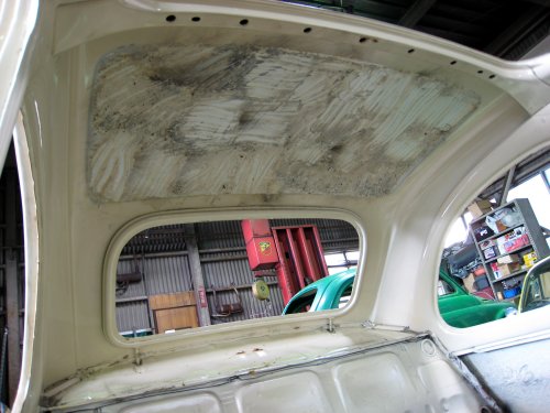写真9.キャンパストップを外したルーフ この部分は、長年に渡り一生懸命磨いてきたので、まだまだ塗装はキレイである。 |