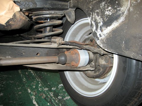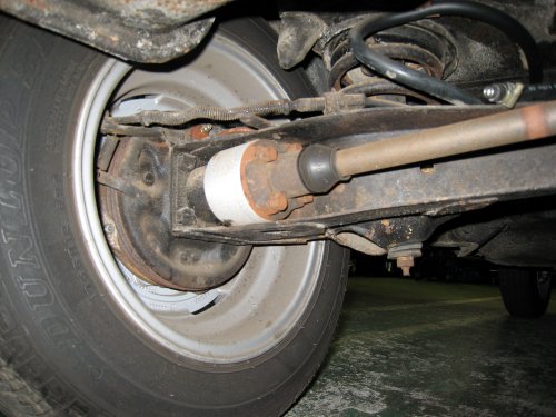 写真14.右後輪部分 せっかくなので、普段目にすることが難しい部分の写真を撮影しておいた。これは右後輪部分。フレキシブルジョイントは、数年前に新品に交換してある。ブレーキ系統もオーバーホール済みで、今回は特にいじるところは無い。 |