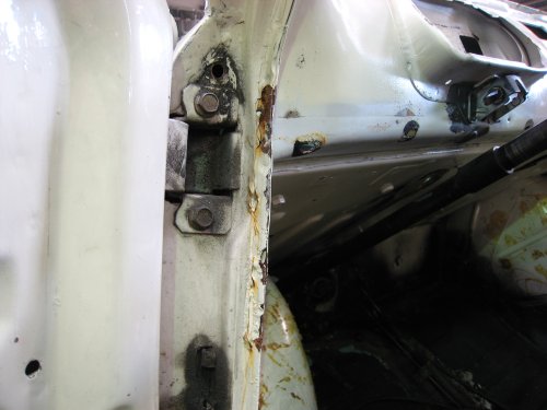 写真18.運転席側ドアヒンジ部分 ゴム内部に溜まった水分で、錆が発生している。 |