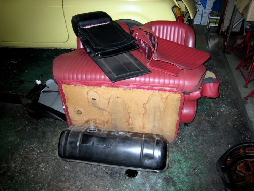 写真19.取り外した部品類 ドア内張は、かなり悲惨な状況だった。しみ込んだ雨水で基板が変形、変色している。目に見えなかった所とはいえ、これは酷い。ガソリンタンクは、この後のチェックで、錆が発見され、大変なことになっていたことが判明するのだが、その話しはまた今度。 |