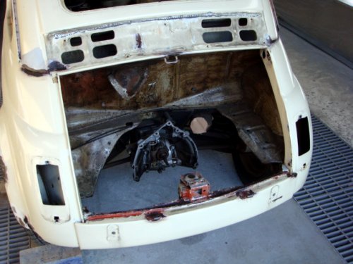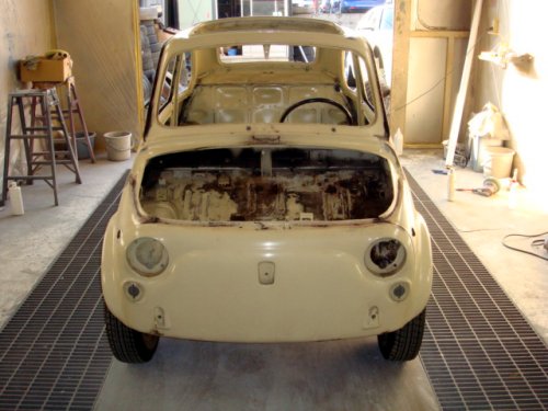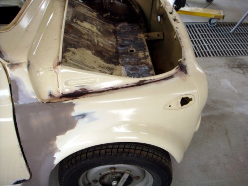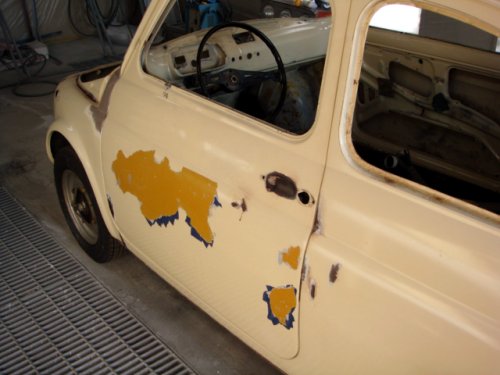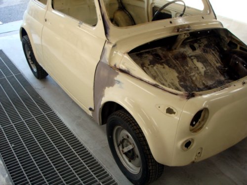 板金塗装準備のため工場での部品取り外しが終わった500は、塗装ブースに持ち込まれて板金作業が行われた。これはその時の模様を、オンタリオSS、Y口J郎さんに撮影して頂いたものである。お忙しい中、経過を記録して頂いた同氏に、改めて感謝したい。 筆者の500は、一見キレイに見えるのだが、細かいところではかなりやつれが出ていた。ドアの下やリアのピラー付け根付近には、500お約束の錆が出ており、一部は泡状にふくらんでいるところもある。ドアは無数の細かいひび割れが入っていたし、エンジンルームの内部も同様だ。 以下の写真を見てもわかるように、細かい点を洗い出して、全てタッチアップしているのが判る。泡状の錆は落とし、へこんだりゆがんだ部分は叩いて修正し、穴が空いた部分はパテを入れる。元の塗装の弱い部分は、一部剥離している。筆者はこの作業の状況を実際に見ていないが、きっと大変手間がかかるのだろう。。。 これら一連の写真を見て思ったのは、右側(助手席側)よりも左側(運転席側)の方がヤレが多いということだ。運転席のドアは、一番多く開け閉めするところであり、当然かなりの負荷がかかる。また、筆者の500は、一応屋根付きの駐車場に停めてあるのだが、運転席側の方が雨が当たりやすい。こういったことが原因で、長年に渡り錆の出方が異なってきたのではないだろうか?