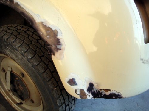 写真5.右側リアフェンダー付け根の部分 500のウィークポイントと言われている所。筆者のクルマもご多分に漏れずここに泡状の錆が浮いていた。 |