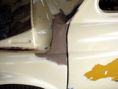 写真14.右側フェンダー部分 ドアとの境界にかけて、かなり大規模に補修されている。 |