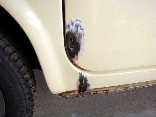 写真12.運転席側のドア下部 ここも500の泣き所である。ドア内部に溜まった水で錆びやすい所だ。筆者の場合、部分的に泡状になっていた。 |