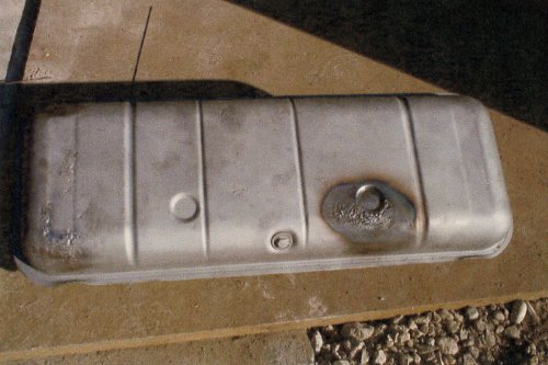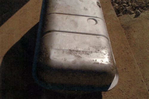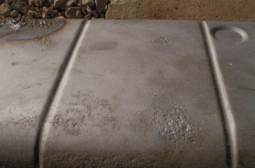 写真2.ガソリンタンクの裏側 あちこちに錆が浮き出ていることが確認できる。かなり危険な状態であった。大事に至る前に発見できたのは大変幸運であったと言えるだろう。 |