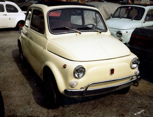筆者の500は、1998年11月15日、東京都内にあった某ショップで購入したものだ。FIAT 500の購入は、基本的にBTOであるため、受注後イタリアで塗装、メンテナンスを開始し、日本へ輸送されてくることになる。従って、購入した時点では、筆者は自分のクルマがどのような外観をしているかを見ていない。内装、外装の色と年式(Lタイプ)を指定したのに過ぎなかったのだ。。。 さて、上記に掲載した写真は、1998年12月27日に、イタリア現地のモータープールで撮影されたものである。塗装を終え、明日にも船に積み込まれる500を、現地エージェントが撮影し、東京へ郵便で送ってくれたものだ。船便による輸送には約2ケ月を要するため、筆者が現車を見たのは、実はこの写真が初めてだったのだ・・・ そぼ降る雨の中、舗装されておらず小石だらけの寂れたモータープールの一角で、フロントボンネット半開きの状態で撮影されたこの500の表情は、なんだかとっても寂しくて不安そうである。これから向かう異国の地で、一体どんなオーナーが待ち受けているのか?新オーナーはキチンとメンテして乗ってくれるのか?「嫌だ!オレは行きたくない!」とでも言っているような表情だ。とにかく、筆者が最初にこの写真を見た時に感じたのは、このようなことだった。 その後、現車は1999年2月24日(水曜日)に、横浜港に無事到着。関税手続きを経て都内のショップのヤードに保管された後、3月21日(日曜日)に筆者宅へ納車された。