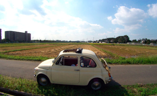 ■2003/09/28〜2003/12/23掲載 2003年は9月に入ってからの残暑が長かったのですが、さすがにお彼岸が過ぎると、ようやく涼しくなってきました。9月28日(日曜日)は、秋晴れのとても良い天気で、少し気温が高いものの、湿度が低くて快適な一日でした。久しぶりにいつもの農道へ、チンクェチェントを引っ張り出してきました。最近の台風でボディは汚れ放題ですが、気候が良くなったせいか機関は快調そのものです。畑ではすっかり稲刈りが終わっていました。16.8mmの超広角レンズで撮影した畑は、本当に空が高く感じます。これからドライブに良い季節が始まります。