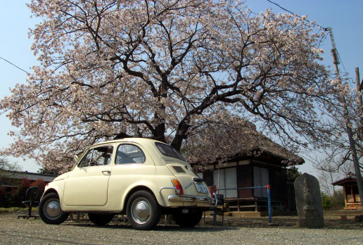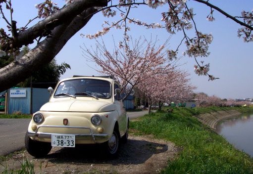 この期間中は、TOPの画像を2枚掲載しました。見沼区深作を流れる綾瀬側の川岸での撮影です。川を挟んで右側には、東北自動車道が走ります。深作のこのあたりは大変のどかなところで、川沿いの細い一本道には桜並木が続いています。地元の人も、サイクリングや散策を楽しんでいました。桜並木は植えられてからあまり年月が経過していないので、やや小振りの木が多いですが、それでも川岸に一面に花が咲くと迫力があります。この一帯は農家が多く、今も昔ながらの納屋を持った広い家が点在しています。チンクェチェントでのんびりとドライブするには良い場所ですね。