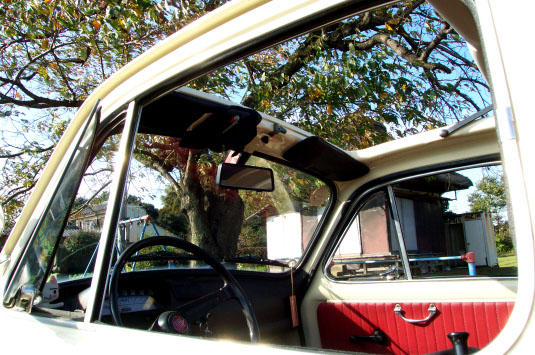 ■2005/09/18〜2005/11/17 さいたま市見沼区丸ヶ崎にある薬師堂前で撮影した、秋のショットです。撮影は2003年11月18日。紅葉が見頃になり始めた頃の写真です。FIAT 500の運転席側ウィンドウ越しに、フロントガラスとオープントップに紅葉したサクラの木が入るようなアングルを選んでみました。このような超広角撮影に使用するデジカメは、もちろんKodakのDC-4800。たかだか320万画素と、現在のデジカメとは比較にならないくらいプァ〜なスペックですが、その色作りと操作性、そして広い画角は、他の追随を許さないものがあり、未だに愛用しています。 この写真は、ノーマルの28mmレンズを16.8mmに変換する、ワイドコンバージョンレンズを装着して撮影しました。このコンバージョンレンズは、狭い室内の撮影に威力を発揮します。それにしても、Kodakのデジカメは本当に色作りがキレイです。筆者は他にCanonのIXYを使用していますが、IXYの寒色系画質に比較すると、Kodakはとても暖かい暖色系で、風景写真にはもってこいですね。ともすれば画素数ばかりに目が行ってしまう、スペック一辺倒の日本市場ですが、その中でKodakのデジカメは貴重な存在だと思います。