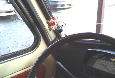 クルマのドレスアップと言えば、アルミホイールだのエアロパーツだの を考えがちであるが、チンクェチェントオーナーとしては、もっとこう オシャレに行きたいものである。で、今回試してみたのが、この「一輪 ざし」もどき。今でも、ちょっとオシャレなオーナーは、自分の古い車 のダッシュボードに、一輪ざしを飾っていたりする。クルマの機能面に は一切無関係ではあるが、ドライバーの心を癒すという意味で、なかな か味わいのあるドレスアップだ。このエスプリ、最近の若いモンにはわ かるめぇ、などと粋がっていると、「じじい!」とか言われそうだな。 さて今回は、吉祥寺パルコ地下一階のショップ「コンテンツ」で購入し た花瓶を使用した。この花瓶、試験管に吸盤がくっついたような構造に なっているので、フロントウインドウに吸着させることが可能だ。ちな みにお値段はというと、確か700円前後だったと思うが、忘れてしま た。本来の一輪ざしならば、ここに本物の花を活けるところなのだが、 枯れたりしてメンテナンスが大変。で、若干邪道ではあるのだが、ドラ イフラワーを入れてみた。走行中の振動で飛び出さないよう、茎の部分 にティッシュを巻いて固定してある。これを運転席の左側フロントウイ ンドゥに吸着させると、なかなか気分が出てよい。 もともと、この一輪ざしをやってみようと思ったのは、シトロエンDS の写真集を見たからだ。フランスの本である「CITROEN DS」 写真集(OSPREY CLASSIC MARQUESシリーズの中の 一冊)に、コンバーチブルDSのダッシュボードを撮影した写真が掲載 されていたのだが、フロントウインドゥ左端に小さな花瓶が備え付けて あり、菊の花が活けてあった。近未来的なDSのダッシュボードに菊の 花、この取り合わせは絶妙で唸ったね。これに影響されて今回やってみ たというワケである。わかる人にはわかる密やかなドレスアップ、旧車 に限らず現代の車のオーナーもやってみてはいかが?