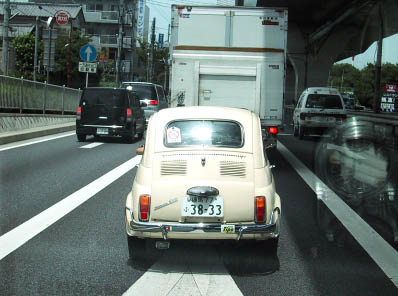 | 写真5.笹目通りの左斜線を、よろよろと走るチンクェチェント。 そこそこの混み具合なので、スピードも抑え気味で助かる。どの車もエアコン 全開で窓は鬼のように閉め切っており、見るからに快適そう。時々隣りの車線 を走る車から、奇異な目で見られる。いったいこの暑い最中、何をやってるん だといった感じ。。。。いや、実際何やってんだかなんだけどね。 |