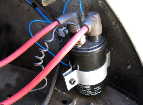 写真2.同時点火コイルユニット 同時点火コイルユニット。日本製でダイアモンド電機株式会社製造のもの。同社は高圧制御回路にノウハウを持っている。FIAT500の同時点火コイルとしては、だいたいこの製品が用いられることが多い。一次抵抗値は1.8Ω。これに外付けで1.7Ωのセメント抵抗を接続し、総計3.5Ωの一次抵抗を得ている。整備マニュアルでは一次抵抗値は3.2Ω以上と規定されているので、大丈夫。今までのイグニッションコイルと異なり、二次ターミナルが二つある(当然か。。。) |