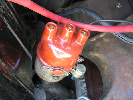 写真3.ディストリビュータキャップ上部 同時点火コイルを導入することで、デストリビュータキャップからの配線は当然のことながら不要となってしまう。そのため、デスビは見るも哀れな姿をさらす。同時点火の最大のメリットは、デスビキャップとデスビロータが不要になる点。信頼性の向上には、計り知れない効果がある。ところで、デスビはこのままの状態にしておくのが良い。いざとなったら、ノーマルの点火系にすぐに戻すことができるからだ。 ヽ(´ー`)ノ |