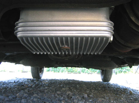 写真7.アルミオイルパン装着時のリアビュー アルミオイルパン装着時のリアビュー。今までの黒い鉄製オイルパンでは、今ひとつ締まらなかったオシリが、銀色の箱によって引き締まって見える。ちょっとしたことだけど、結構効果は大きい。一回アルミオイルパンを装着してしまうと、ノーマルのオシリは何となく寂しく見えてしまう。ファッションとしても効果は大きい。 |