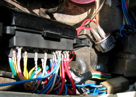 写真8.ハーネス交換後のヒューズボックス ぜ〜んぶ新品のケーブルで作り直したハーネス。ヒューズボックス周りのキレイになり、ホントに気持ち良い。右上に見えるリレーは、ハザード用のもの。 |
