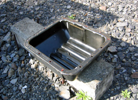 写真12.交換した鉄製オイルパン(2リットルタイプ) 今まで使用していた鉄製のオイルパン。容量も少ないし、いかにも頼りない感じがする。とはいっても、実用上はまだ十分使用可能だ。もったいないから保存して置こう。 |