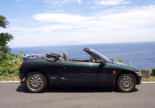 ・撮影日 :1998年06月20日(土曜日) ・撮影場所 :伊豆国道135号旧道大川温泉付近 ・使用カメラ:Kodak DC210 ・コメント : BEAT側面 エッジの効いたスタイルが良くわかる。この写真は、伊豆の東海岸を 通る国道135 号の旧道で撮影した。旧道は山の中を走っており、セン ターラインも無い細い道であるが、景色は抜群に良い。写真中央、海 の向こうには、伊豆大島がはるかに見える。