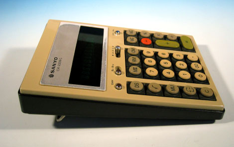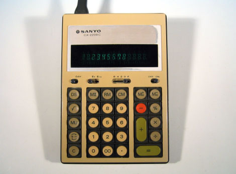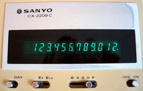 三洋電機株式会社が発売した12桁FIP表示のデスクトップ電卓、CX-2209Cである。正確な製造年は不明であるが、使用されているチップ構成と演算機能の豊富さから考えると、おそらく80年代初頭のものと思われる。 17.8×12.2×3.5cmの筐体で、薄型に出来ている。本体重量は423g。電源はACのみで、本体背面にACコード接続用のコネクタが設けられている。ACコネクタ形状はメガネタイプの一般的なもの。仕様的にはかなり豊富で、四則演算の他にメモリ機能、√演算、%演算、Σ演算などが内蔵されている。キーは極めて堅牢で、コクコクとしたタッチであり、事務用電卓としては極めて実用的だ。デザイン面での面白みは少ないものの、キーがブロック状に分割されており、キートップが丸くなっているところなど、現代の電卓には無い造形も見て取れる。 本体は前面パネルがアイボリー、背面カバーがこげ茶色の2トーン。もっとも、前面パネルは陽に焼けてしまい、すっかり黄色と化してしまっている。本体裏面には傾斜を付けることができるスタンドが搭載されている。 本体裏面の銘版には以下の記述がある。