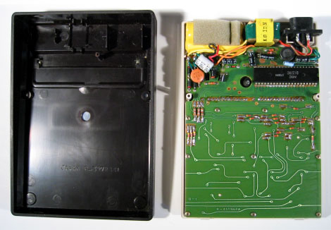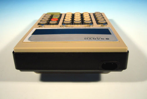本体内部は極めてシンプルだ。この電卓がAC駆動であることを考えると、電源回路が簡素なことに驚かされる。メインLSIはNEC製のμPD1220C。FIPのドライブも含めて、全てを1チップで処理しているため、周辺部品は極めて少ない。42 Pin のプラスチックDIPパッケージで、製造年の捺印は無いが、K7Z056の表記がある。 電源回路には小型の電源トランスを内蔵しており、整流はダイオードがブリッジ状に使用されている。AC駆動電卓には珍しく、本体内部にNi-Cdの充電池が内蔵されている。Type 2N-450と表記された充電池は2.4V、450mAの製品で、おそらく本電卓に内蔵されているカレンダー機能のバックアップ用と思われる。充電池が得意な三洋らしい付加機能と言えるであろう。 本体背面カバーの裏側には、JAPAN R-3972331の刻印があった。この頃の電卓は、内蔵機能は全て使用する演算LSIにより決定されてしまっている。
