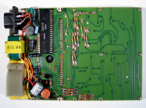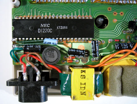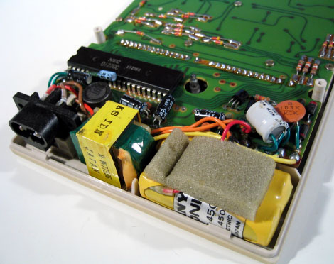 写真11.電源回路周りのアップ。 本体内蔵の充電式Ni-Cdバッテリが見える。内蔵されているカレンダー機能のバックアップ用充電池である。 |