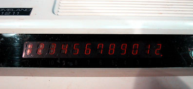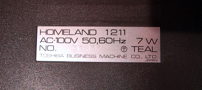 ■TOSHIBA HOMELAND 1211 TOSHIBA BUSINESS MACHINE製造の12桁オレンジ 色FIP表示タイプの卓上電卓。東芝ビジネスマシンとは、またいかつい名称 であるが、当時は○○ビジネスマシンという名称が流行ったようで、けっこう 見かけることがある。コモドールビジネスマシンというのも、その一つであろ う。機能面では、別途掲載したHOMELAND 1212Sとほぼ同等。使 用しているLSIも同じである。大きさは19.5×20×6.5cm。70 年代スペースエイジ感覚に富んだデザインは、PanacのJE−800や JE−802に通じるものがある。電源はAC100Vのみ、電源コードは着 脱可能タイプで、コネクタは特殊形状である。本機のシリアル番号は、 318335番。ルート演算機能とメモリ機能を有している。小数点の桁数は F、0、3、6に設定可能。 本機の正確な製造年は、本体に記載が無いため不明であるが、おそらくは 1973年(昭和48年)頃のものだと思われる。